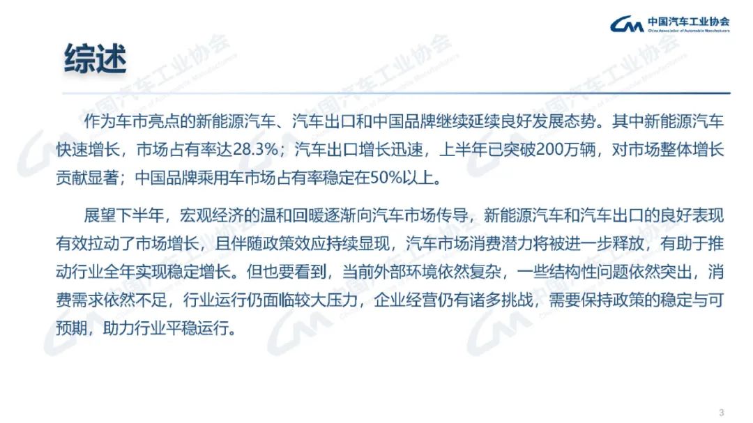 展望下(xià)半年(nián),÷π€±宏觀經濟的(de)溫和(hé)回暖逐漸向汽車(chē•♦Ω)市(shì)場(chǎng)傳導,新能(néng)源汽₹λσ車(chē)和(hé)汽車(chē)出口的(de)良好(hǎ&↔≈o)表現(xiàn)有(yǒu)效拉動了(le)市(sh ★ì)場(chǎng)增長(cháng),且伴随政策效應持續顯現(xiàn),☆β>汽車(chē)市(shì)場(chǎng)消費(fèi)潛力将被進一(yī)ε≈≤步釋放(fàng),有(yǒu)助于推動行(xíng)業(yè)全年(nφ "←ián)實現(xiàn)穩定增長(cháng)。但(dàn)也(yě)要↓Ω©(yào)看(kàn)到(dào),當前外(wài)部環境依然複雜(zá),↓₽一(yī)些(xiē)結構性問(wèn)題依然突出,消費(fèi)需求依然不&←(bù)足,行(xíng)業(yè)運行(xíng)仍面臨較大(dà)壓力,企∏✘業(yè)經營仍有(yǒu)諸多(duō)挑戰,需要(y₽δ™©ào)保持政策的(de)穩定與可(kě)預期,助©✔♥®力行(xíng)業(yè)平穩運行(xíng)。